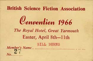 BRIAN ALDISS: The convention at Great Yarmouth was very untypical in that some attendees had a little too much to drink. My wife and I slept in a room in the hotel used by Charles Dickens when he was writing 'Great Expectations', I remember. [Actually 'David Copperfield', according to the Programme Book.] RON BENNETT: The programme began at 8.15pm on Friday, 8th April, with the evening meal for those actually staying at the Royal, full board being part of the weekend arrangement. The seating at this meal was deliberately arranged so as to mix newcomers with older hands and opinions expressed tend to stress the atmosphere of friendliness which pervaded throughout the entire Con; there is little doubt that the Friday evening dinner promoted this right from the start. PETER WESTON: This was the year of the running battles between Mods and Rockers along Yarmouth seafront, this was the convention - unique in British fan-history - where the management insisted we had half-board terms, so we all sat down together at the same time in the hotel dining room. Rog was disgusted - "the worst food I've ever eaten during a convention," he said, but then he never did care for conventional English cooking. I liked the community atmosphere, which mixed us up and gave me a chance to meet people I might not otherwise have had nerve to approach. Eric Jones, for instance, Grand Master of the Order of St Fantony, who seemed very friendly, and Ken McIntyre, an old boy from London who was an artist, and generously offered to do me a cover for my fanzine.