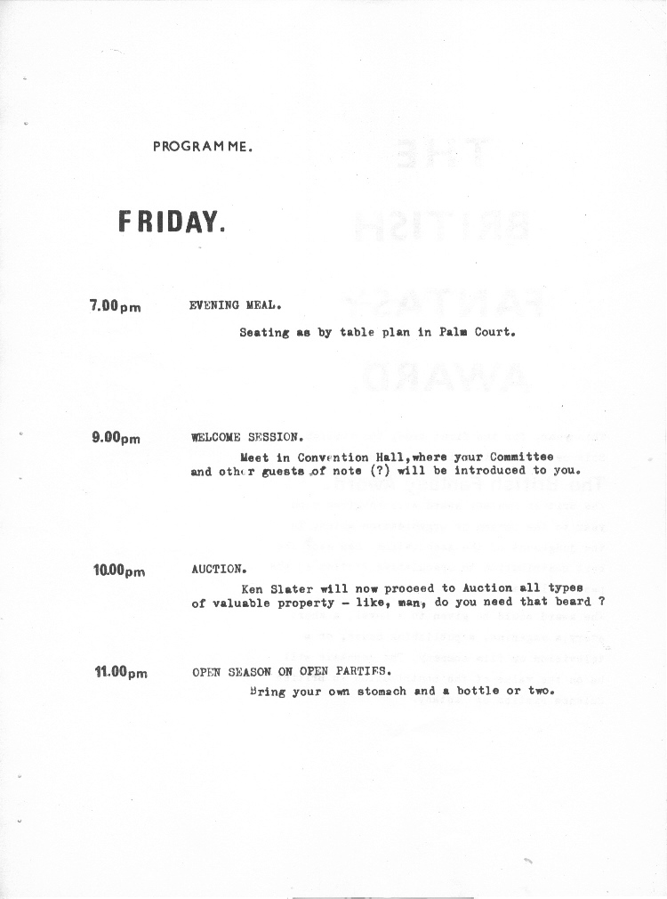 YARCON - THE PROGRAMME BOOKThe Eastercon 1966 Programme Book is 30 pages long (inc. covers), quarto, and tucked inside a green wraparound American quarto size cover. Those pages that are just publishers' ads, tourist info and the like have not been included here. What follows is more or less just the editorial material.No information on Progress Reports, if any.