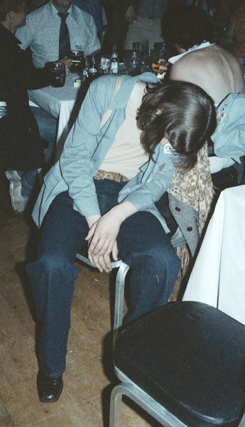 ALAN DOREY: Rich Coad knew where we were going. My drink supply was low. My balance wasn't what it could have been, and we just had to find somewhere that resembled a room party. "Gee, this place looks kinda neat." The door, already ajar, was breached like one running the four minute mile in ten seconds, and we fell on top of an untidy group of other people, each displaying a different stage of inebriation. Apart from Brian Parker, attempting to talk to a captive audience of Heady Matters, it looked well appointed-- a nice long bench along one wall, a deep pij.e carpet, and three doors at one end. Large cans and bottles of booze appeared, and soon disappeared in the approved manner. Joe Nicholas also materialized from somewhere, so he was allocated a space in one corner just in case he lapsed into unconsciousness again. "Where's the bog?" I somehow managed to splutter, realizing that my bladder was exerting far more pressure on my brain's decision-making process than was my craving for alcohol. An American female lying sprawled across the floor flapped ineffectively towards the three doors. "Great, which fucking door is it?" With a stunning display of logic, spiced with a fear of great embarrassment, I tried the first... and success. Bladder relieved, I staggered out again, only to see Joe fall out of the adjoining door with a similarly soporific smile upon his face. "There's two bogs in this room?" I said, marvelling at my powers of deduction. "Right on there chief." I then saw Mike Dickinson stagger into the third door. "Another bog?" Mike grinned as only drunks can. Bloody Hell! What an absolutely superb hotel room... lots of carpet... lots of room... three bogs... and can't even see the beds! And Christ... what bloody huge ash trays they've got in here! Even down to the instructions on how to incinerate cigarettes. Must be to help the Americans.