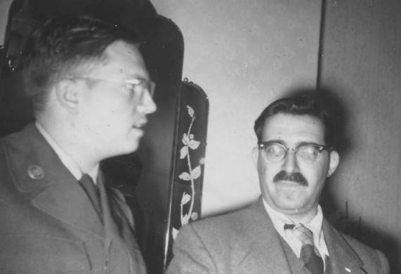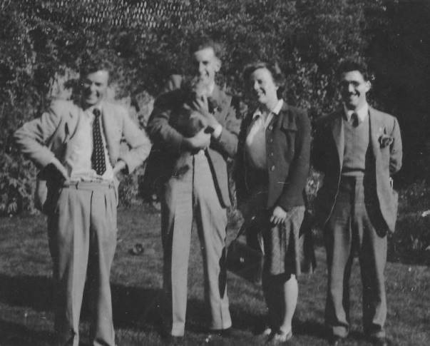 Then meeting Webster family who are making such a magnificent success of living together in a family and still getting on well - I could say a lot about the Websters and their methods, but Doug wouldn't be able to give his approval first as I'm doing this straight on a stencil. Ride to Banchory and the river Feugh and finding Doug waving a hay fork and still talking. Bookshops and Brother Tony's excellent records, intermingled with Mother Webster's excellent food. At night pubs, and invariable Webster conversation and hospitality until 2 am. The next night an all-night journey back but leaving Edwin and Michael to visit Dr. Gibson at Edinburgh - that is their story. It was a wonderful holiday. I can't say anything about *what* we did like the people who keep on writing informative accounts of fan meetings. Also I promised Michael to write a review of the play "Doll's House" which Ron Lane and I went to see in London and I have a feeling that he meant that to appear on this stencil too. Perhaps I could bring the two in together by comparing the Webster household with what Ibsen would have approved of. But I don't want Doug to get a bad impression of me especially as he did say something about all of us going back for Hogmanay. J. Michael Rosenblum: I've been pleasantly busy here of late, but not least pleasantly so, in entertaining visitors. Included is a weekend when Frank Parker and Allan Miles were in Leeds; at the end of August I went holidaying in Scotland and called, chez Doug Webster, Edwin Macdonald, Dr. W. A. Gibson, and Osmond Robb. Joyce Fairbairn who was along part of the time includes her impressions [above]. During the last two months callers at Grange Terrace have been Edwin Macdonald on his way South, Ron Lane of Lanchester--twice-- Sgt Norman Lamb of Toronto who is a ruddy-faced, cheery, bibliophile after my own heart, expert on pornography -- especially the classic pornographic works-- or would it be more accurate to say the pornographic classics? Don Smith once pointed out that the recipe for a work enduring through the centuries includes a modicum of fantasy and a modicum of filth. Just after Norm Lamb left, a phone call from Aberdeen informed me that a certain Milton A. Rothman was present there and intended to make Leeds his next stop. To tell the truth, Milty rather surprised me with his general quietude and reticence; unless, as is possible, the laddie was somewhat shy in this hectic household. Next caller was Al Godfry who emanates from somewhere in Southern Ontario and had been with a Canadian engineer unit in the front line fighting Caen in Normandy to the Ems canal in Germany, via Belgium and Holland, notably at Arnheim, Al was almost the opposite of what I had envisioned--tall, sturdy, self-possessed with plenty of confidence and composure and a faculty for making himself at home anywhere within a minute or two. All these visitors amused my two year old nephew enormously. No sooner has he got used to saying Uncle Nor-Nor, then its Uncle Milty, and Uncle Milty gives place to Uncle Ally within a few days. Incidentally, Milty and Al Godfrey did manage to meet up for a couple of hours and I'm hoping to see the results of some candid camera snap-shooting before long.