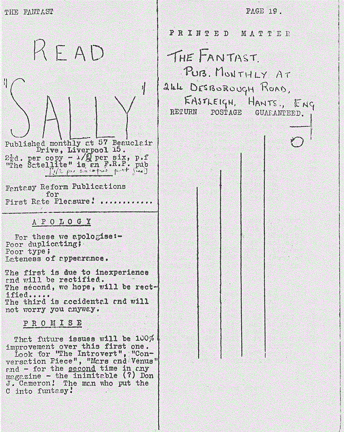 Before actual production of this magazine was begun, we had many high notions of what we were going to give our readers. Now, after a little hard work, these have been considerably modified and we intend to be very chary of rash promises. With average luck - and a sufficiency of material - "The Fantast" will appear monthly for the rest of the summer, and, we hope, the winter. As I write this, I do not know what the eventual size of this first issue will be, but, whatever it is, future numbers will be about the same. The price, too, will remain constant for at least six months. Contributions are urgently needed - anything pertaining in any way to fantasy - and efforts from both sides of the pond will be welcomed. Articles and essays are in greatest demand, and if we can get these, we shall cut down on the fiction content. In any case, we welcome criticism and advice, especially the latter.