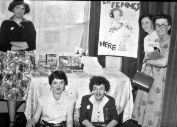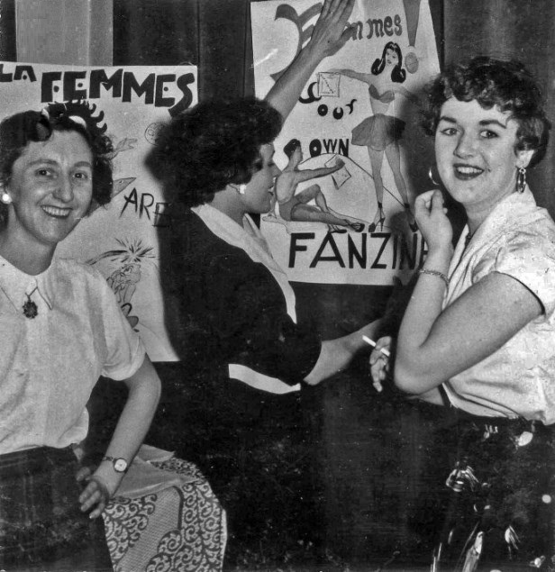FEMIZINE was launched at SUPERMANCON, the 1954 Eastercon, held that year in Manchester. The idea of an all-female fanzine had been bubbling up for a while and several letters had passed between Frances Evans, Joan Carr, and Ethel Lindsay shortly before the convention in which they decided it was time. Carr volunteered to edit the zine, it was launched at the con, and the first issue appeared shortly after. As can be seen from the photos below (taken at the event by Eric Bentcliffe) there was a certain amount of excitement among female fans at this finally happening: