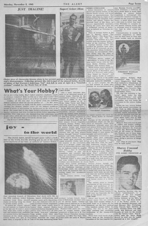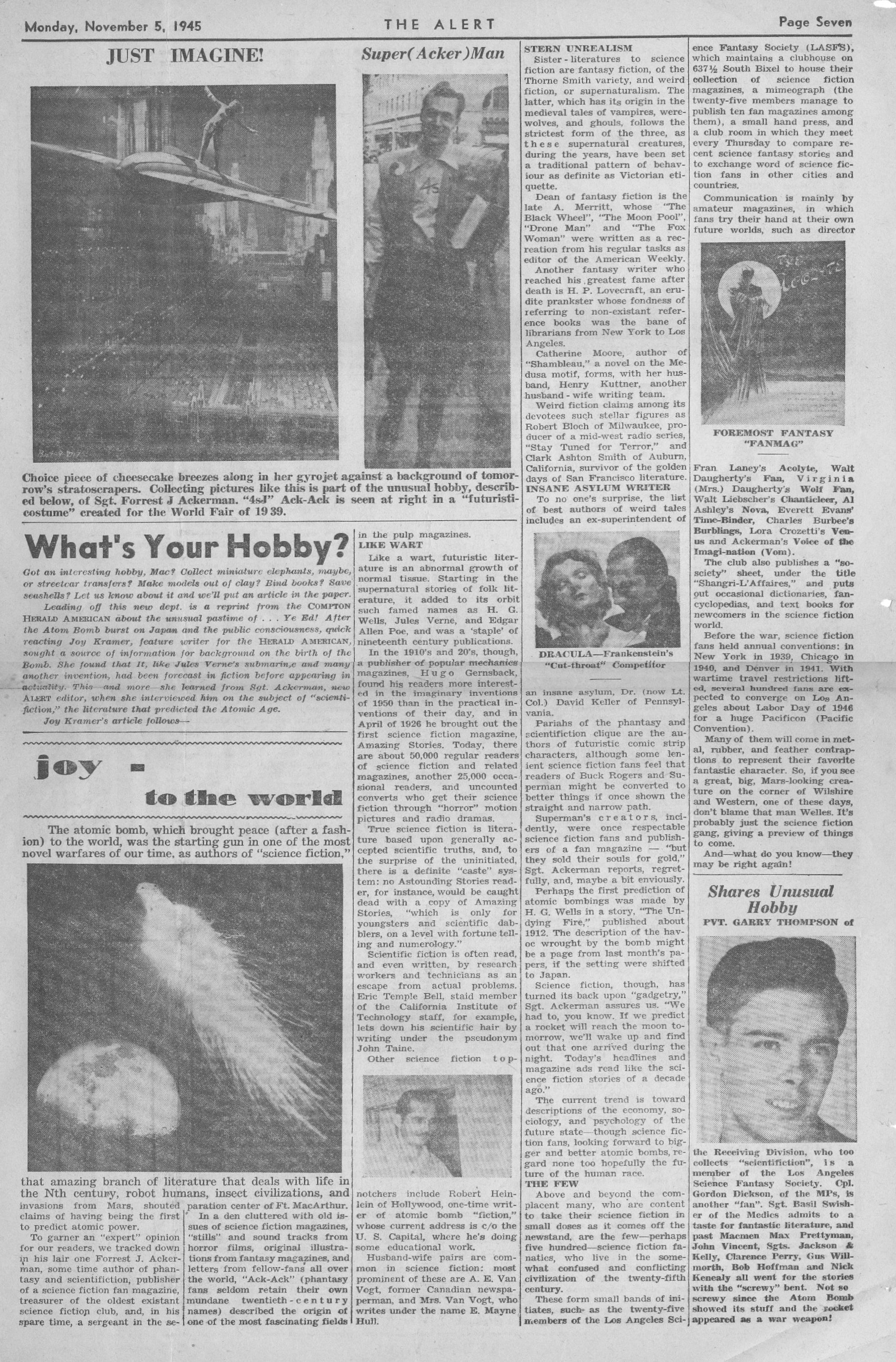 We proudly announce that.Fandom's own, Forrest J (no period) Ackerman achieved the unique distinction of being made Editor-in-chief of ALL news services at Fort MacArthur; promoted to Staff Sergeant and became a year older all in the same month. Ackerman included a page from the 5 Nov 45 issue of 'The Alert' ("that fanzine the Army pays for" - Speer) with copies of VOM #48, one devoted entirely to science fiction and fandom. Click on small image for full-size page.