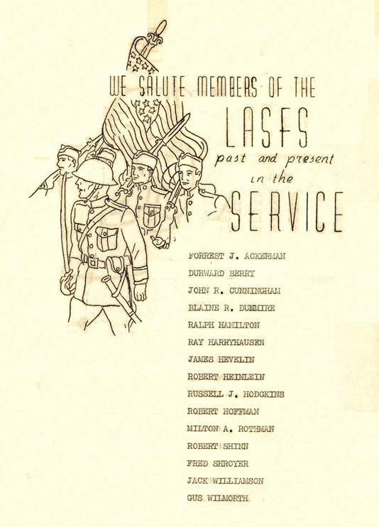 AUGUST 7, On this date our leading member, and fandom's number one face was inducted into the United States Army. Previously, Ackerman was feted in the usual manner of the dear departing. Although his fan activity will be seriously handicapped by his induction, 4e intends to carry on as well he might. Mr. Ackerman has turned the actual publishing and editing of VOM over to Morojo and Barbara Bovard, securing Director Willmorth's financial support on art work, but continues in a supervisory position over the contents and appearance of the fmz. The disposal of the magnificent Ackerman collection has already been widely publicized, but it will do no harm to mention here the worthy project of the Science Fiction Institute. If Forrie is carried into actual combat and is thereby liquidated, one thousand Dollars and the actual collection is to be the embryo of a foundation dedicated to the preservation of science fiction It would definitely be someplace to will those well-beloved collections to - a symbol for the whole of Fandomania to grasp and reverate. Your editor's personal donation will contain original illustrations for which he has paid more than a hundred dollars along with other items such as mags and books. Science Fiction Forward!!!! Here's what Harry Warner Jr has to say about Ackerman in uniform in ALL OUR YESTERDAYS (Advent, 1969):
