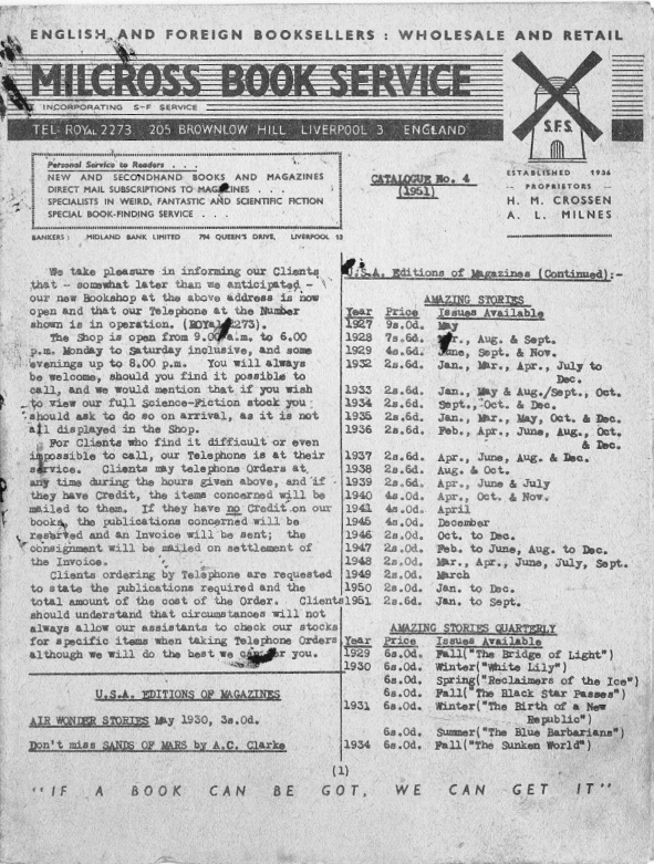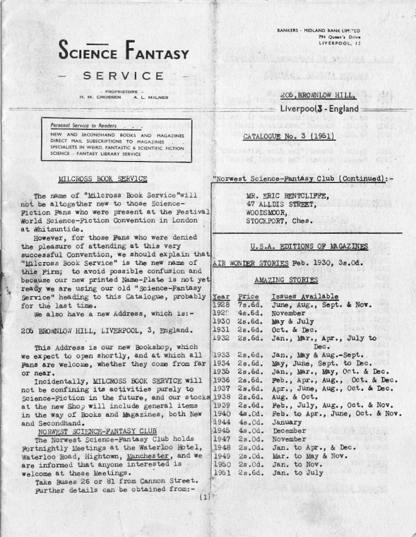 Just as he had with the pre-war Liverpool SFA, Johnson let the newly formed Liverpool SF Society (LaSFaS) hold it's early meetings in his shop. As member Tom Owens later recorded: On Monday the 12th November 1951, we, the Liverpool Science-Fiction Society held our first meeting at the rear of the Milcross Book Shop. At that time we were not grouped under any name, but were just a number of fans who had met as a result of a Post Card sent to, each of us by Jeff Espley, the founder of the Society. The final Milcross catalogue I have is dated 1954, by which point both the Brownlow Hill shop and Frank Milnes are gone (they were still there in 1953) and Johnson has returned to trading from 68 Victoria Street: