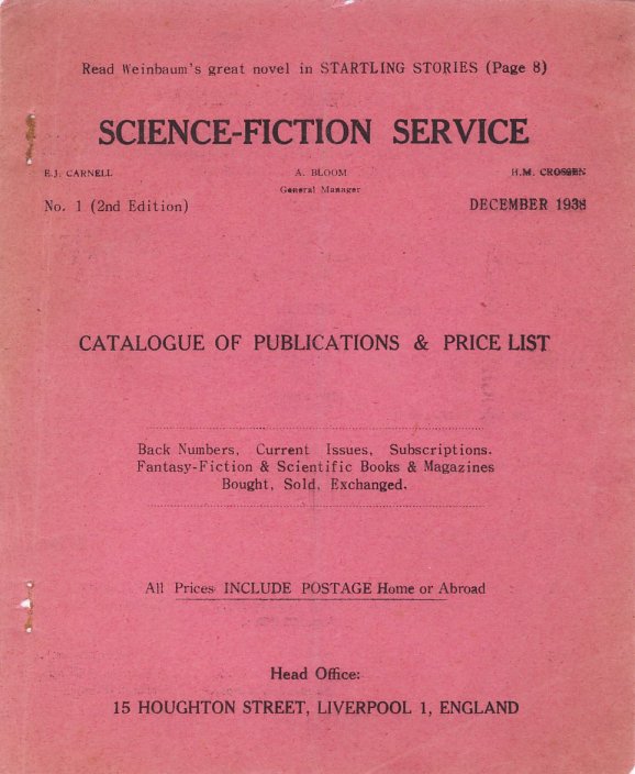 "With Les setting up an office in the centre of Liverpool it became possible to use it as a meeting place in the evenings. He then invited all local people on the S.F.Service books to attend, which included me and I did. So out of this new arising we had Les and Abe Bloom (who was something of a partner) together with Dave McIlwain and John Burke - then me - as the basis of the group. Les Heald came later and several others came in and out vaguely. LesJ worked not very far away in the Liverpool Corporation Education Office (so had Arthur Askey who had left for full-time entertaining a year or two before), Burke's father was a police Inspector, LesH was a clerk in a Civil Engineering firm. On the site of the shop now stands St. John's Beacon, aka the Radio City Tower. The catalogue reproduced here is from the end of that same year, by which point Les Johnson is now operating using his girl friend/fiancee's name (they married 26 Aug 39) - Hilda Margaret Crossen - a practice he would continue when he restarted the business after the war and it eventually morphed into the Milcross Book Service. The catalogue that follows is the earliest in the Vince Clarke Fanzine Collection and also the only printed one - the later ones in the collection are all mimeographed. (Disclaimer: It should of course go without saying that this catalogue is presented here purely for historical interest and that none of the items listed are available for sale any longer. It should go without saying, but there are some odd people out there.)