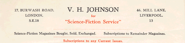 Founded by Les Johnson and Ted Carnell in 1937, the Science-Fiction Service was the first SF book-selling business in Britain, though the name they used for business purposes was that of Johnson's brother, as can be seen on this letterhead from 1937: